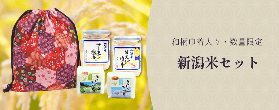新潟米と珍味のセット商品一覧です。期間限定・数量限定!魚沼産コシヒカリと佐渡産コシヒカリの新潟米2種と、三幸のご飯のおともを和柄巾着に詰め合わせ。カジュアルギフトに、ご自宅用にもおすすめです。