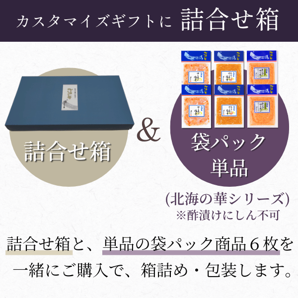 レビューを書く(要ログイン)お好みの袋パック商品を詰め合わせたカスタマイズギフトをご希望の際、袋パック入タイプの商品6枚と一緒にご購入ください。