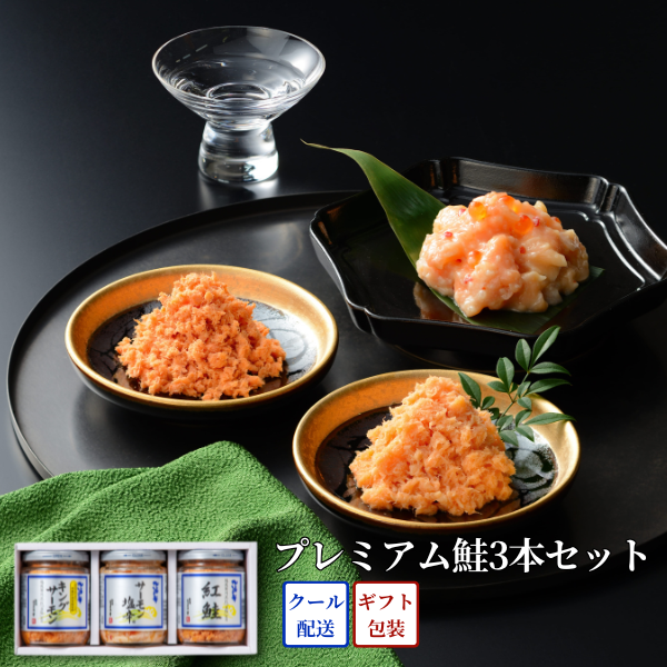 こだわりの糀でじっくりと熟成させた三幸が誇る大ベストセラー「サーモン塩辛」と、職人が厳選した鮭の王様「キングサーモン」、丁寧に焼き上げ手ほぐしした「紅鮭」。鮭の美味しさを実感できる納得の鮭瓶3種セットです。
