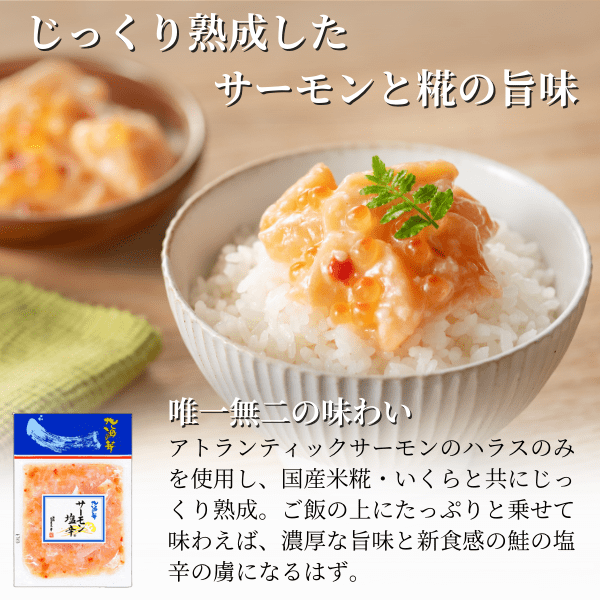 北欧の海で育ったアトランティックサーモンの、特に脂ののったハラスのみを使用し、三幸特製の塩糀と共に熟成しました。サーモンのとろける旨みと塩糀の風味が相まった絶妙な味わいです。