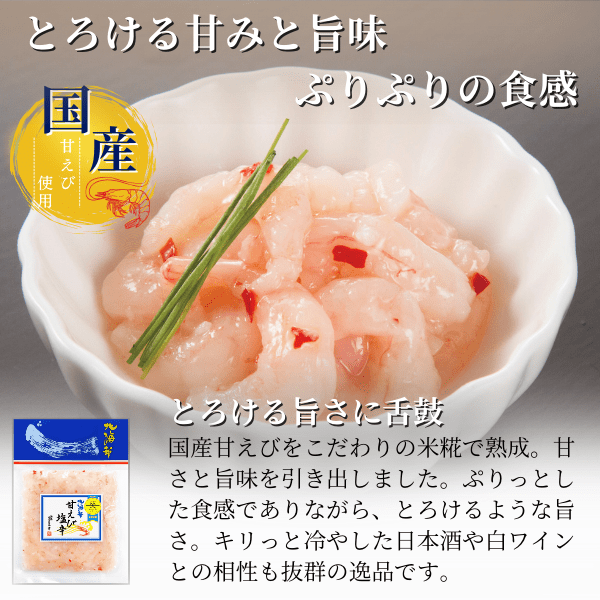 とろけるような甘さとぷりっとした食感が特長の甘えびを、こだわりの塩糀でじっくりと熟成し甘みと旨みを引き出しました。まろやかな味わいは、キリッと冷やした日本酒や白ワインにおすすめです。