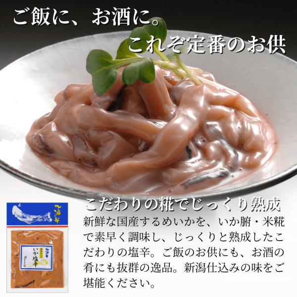 新鮮な国産するめいかを、いか腑・米麹で素早く調味し、じっくりと熟成したこだわりの塩辛。ご飯のお供はもちろん、酒の肴にも抜群の逸品。新潟仕込みの自慢の味をご堪能ください。