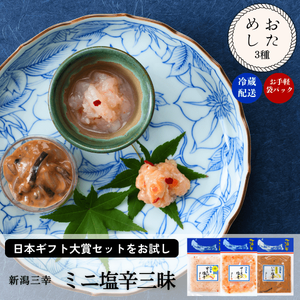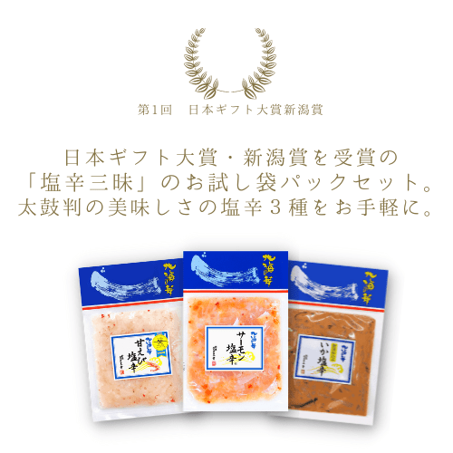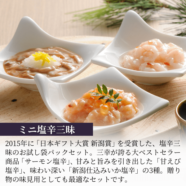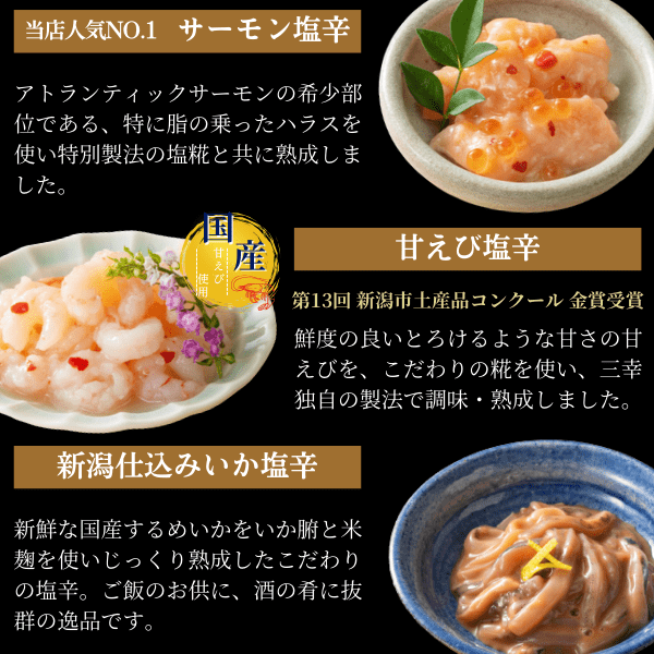 | 内容量 | 【サーモン塩辛、甘えび塩辛、新潟仕込みいか塩辛】各100g |