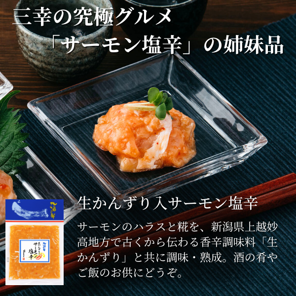 サーモン塩辛の姉妹品。極寒の海で育ったアトランティックサーモンのハラスを、塩糀と越後妙高伝統の香辛料「生かんずり」と共に調味、熟成。サーモンのトロリとした食感に、まろやかな辛みとほんのりとした柚子の風味が味わい深い、人気を博す逸品です。