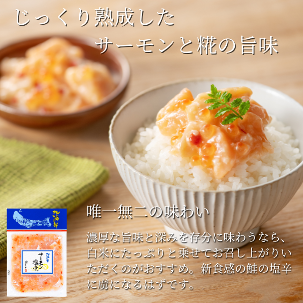 アトランティックサーモンの特に脂の乗ったハラスを塩糀と共に熟成。サーモンのとろける旨みと糀の風味が相まった絶妙な味わいが特徴です。