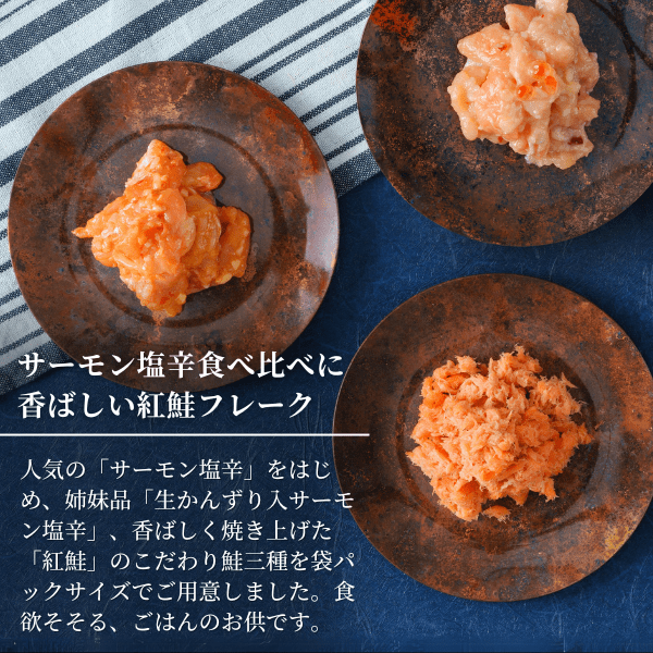 | 内容量 | サーモン塩辛100g×1袋、生かんずり入サーモン塩辛100g×1袋、紅鮭90g×1袋 |