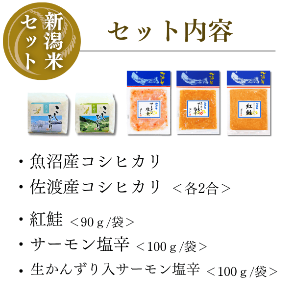 - セット内容:サーモン塩辛100g、生かんずり入サーモン塩辛100g、紅鮭90g、魚沼産コシヒカリ、佐渡産コシヒカリ 各1袋(2合/300g)